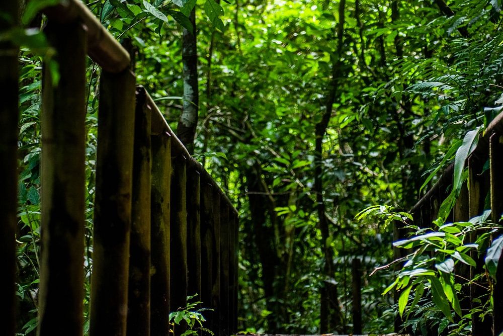 The picture shows an abandoned wooden bridge stretching across a quietly babbling river, surrounded by lush nature. The bridge is old and weathered, with some planks slightly sagging or damaged, adding to the abandoned atmosphere. The wood is weathered to a greyish hue, with traces of moss and climbing plants slowly taking possession of the structure.