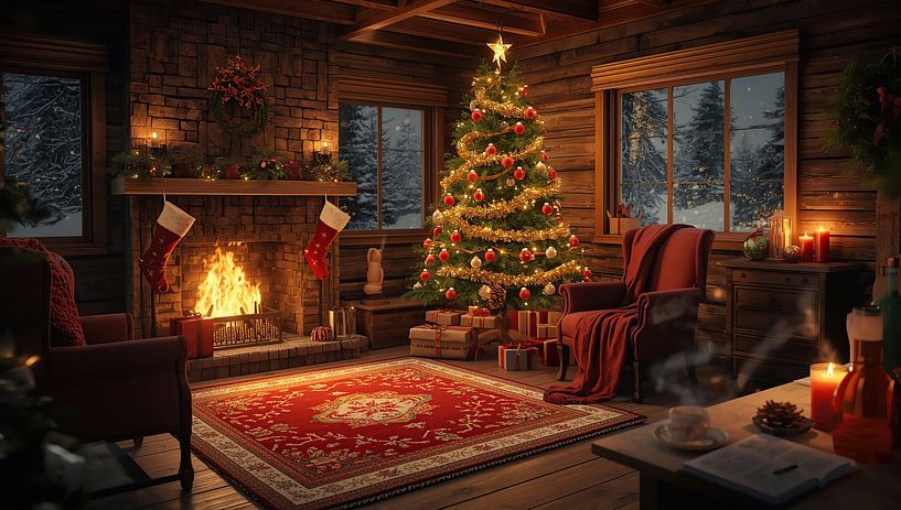 Festive Christmas scene in a cosily decorated wooden hut with a beautifully lit Christmas tree, a crackling open fire and neatly arranged presents