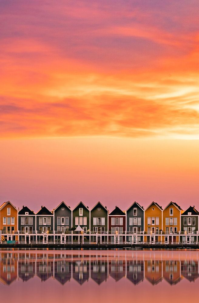 Cottages in Houten with sunset and reflection by vedar cvetanovic
