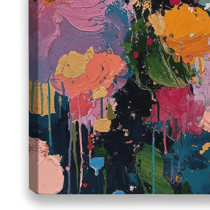 A vibrant and impressionistic floral painting bursts forth with an explosion of colour. Large, soft pink blossoms are interspersed with smaller clusters. The background is created with energetic brushstrokes and splashes reminiscent of a lively, abstract garden. The overall impression is one of joyful abundance with a sense of movement…