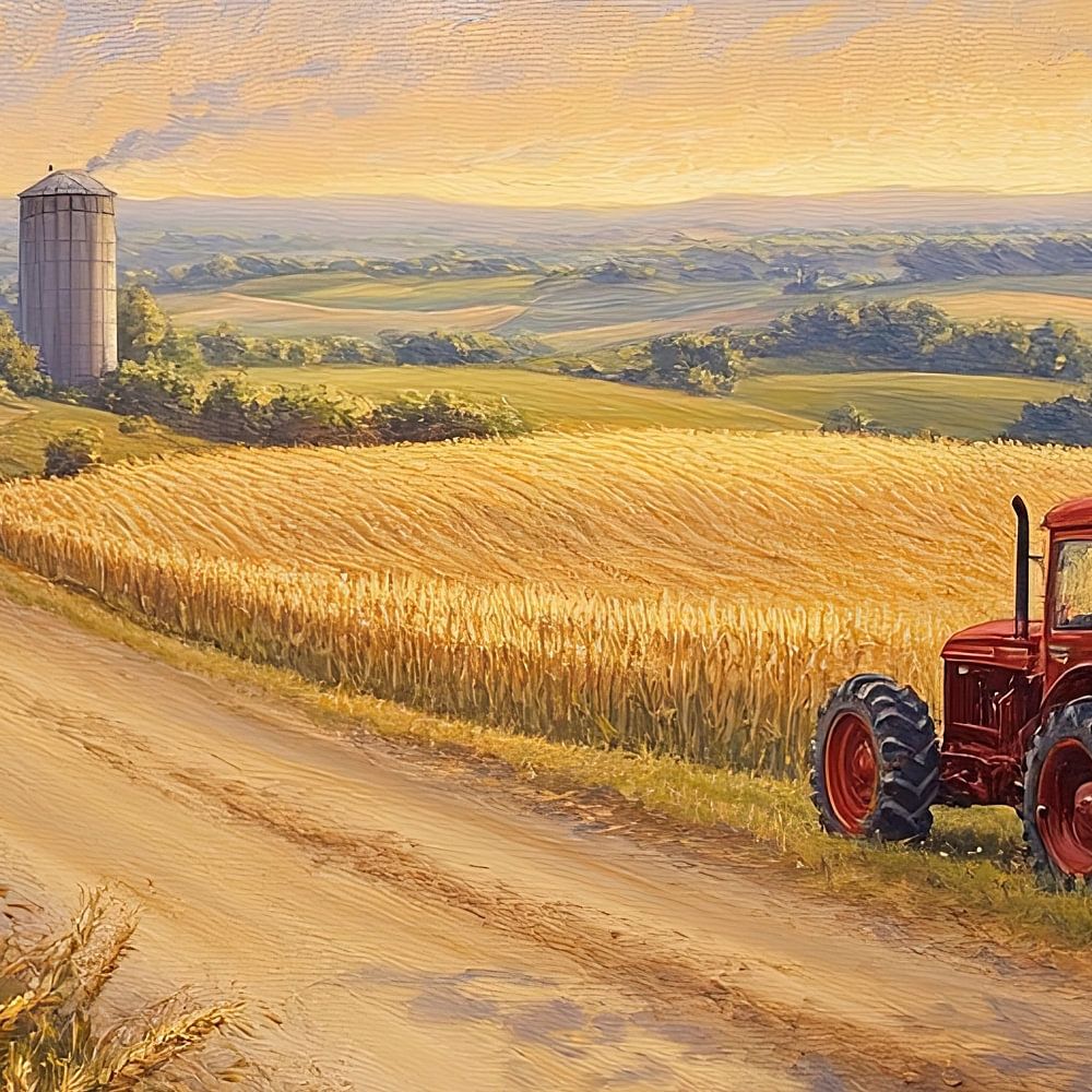 A gentle dusk envelops the expansive fields in golden light, while a bright red tractor rests on the winding track. An old silo tower watches over the peaceful landscape, while two small birds roam around surrounded by nature, as if enjoying the tranquillity of the rural idyll.