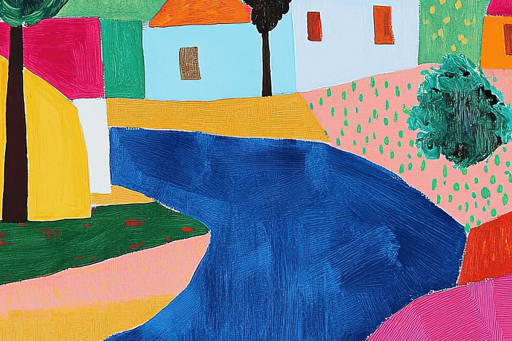 "Countryside Colors" showcases the vibrant charm of rural life, where bold and bright hues bring a picturesque village landscape to life. The painting’s playful use of color and simplified forms captures the essence of a sunlit day, evoking feelings of warmth and joy. The meandering river leads the eye through the scene, inviting viewers to imagine themselves strolling through this idyllic countryside, where every element is infused with color and light.