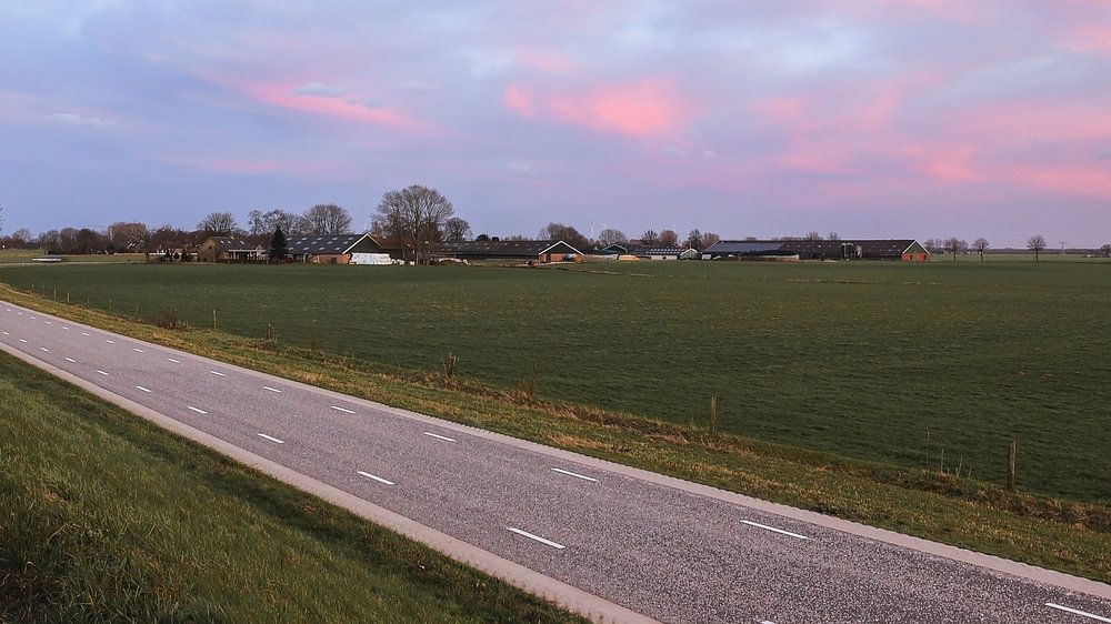 This beautiful photo shows the idyllic countryside during a colourful sunset. The sky is tinged with a creamy pink glow as the sun prepares to disappear. The road disappears into the distance, ending with a farmhouse lying quietly in the distance. It is a tranquil picture of the flat land, mesmerising the viewer with its colourful sky and tranquil landscape.