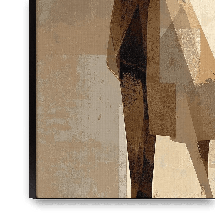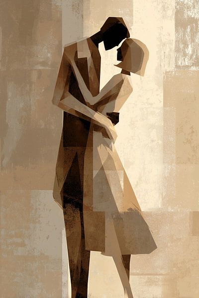 Couple in Soft Geometry - This couple painting depicts a man and a woman embracing intimately and almost kissing, rendered as an abstract painting with geometric, block-like shapes and warm sepia-brown and beige tones that give the painting a modern, soft and romantic atmosphere; couple painting, painting of a couple.