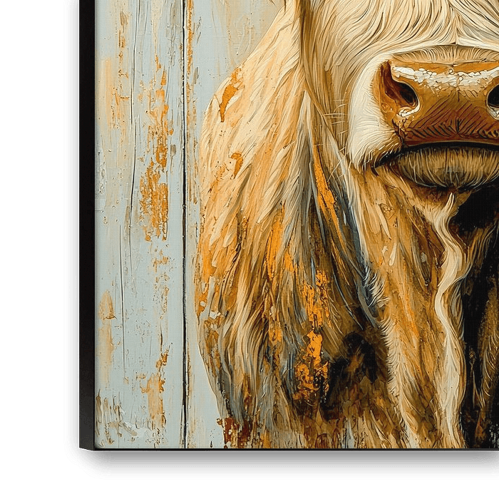 In contrast to this majestic appearance are the small traces of chipped paint on the background. They convey the feeling of living history, as if the wood had already lived through countless seasons. This creates a connection between old craftsmanship and bubbling life, making the picture an appealing, warm-hearted ensemble. Every splash of colour and every blossom seems to tell a story, while the cow's deep gaze allows us to forget everyday life for a moment. This work invites you to linger in the harmonious balance of natural gentleness and luminous energy.