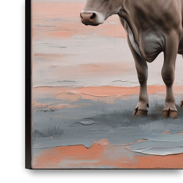 This serene painting shows a beautiful realistic portrait of a cow in a minimalist and soothing landscape. The subdued use of colour with soft greys, warm browns and subtle pastel tones makes it a timeless artwork that fits perfectly into both modern and classic interiors. The calm look of the cow radiates a sense of calm and…