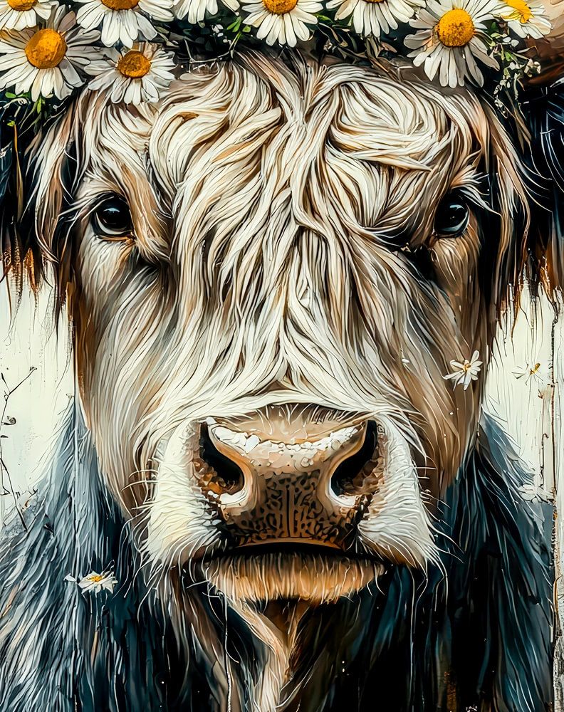 In this portrait, the cow unmistakably takes centre stage with its fascinating interplay of colour and texture. Her coat alternates gently between shades of ash grey and almost silvery reflections, while occasional warming brown tones provide lively contrasts. A crown of sunny yellow daisies crowns her head and emphasises her graceful appearance. The horns appear striking in comparison to the delicate floral decoration, creating an attractive tension between robustness and delicacy.