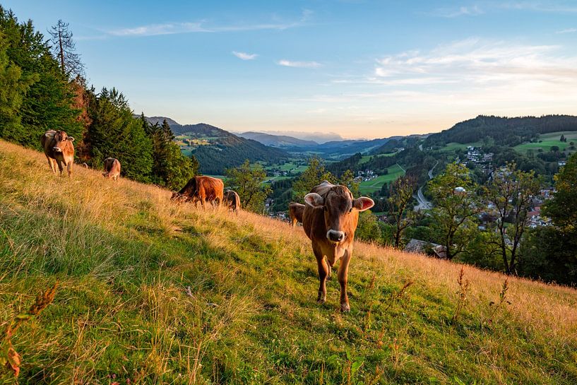 Cows at the Staufen with a view of Oberstaufen at sunset