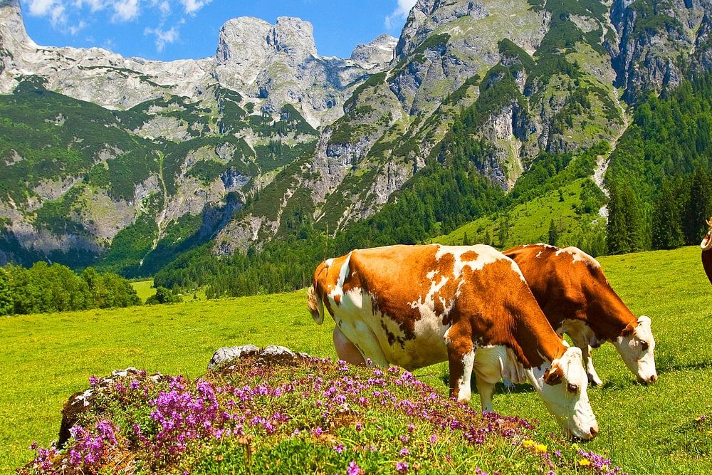 Cows graze in Werfenweng at the foot of the Tennengebirge mountains