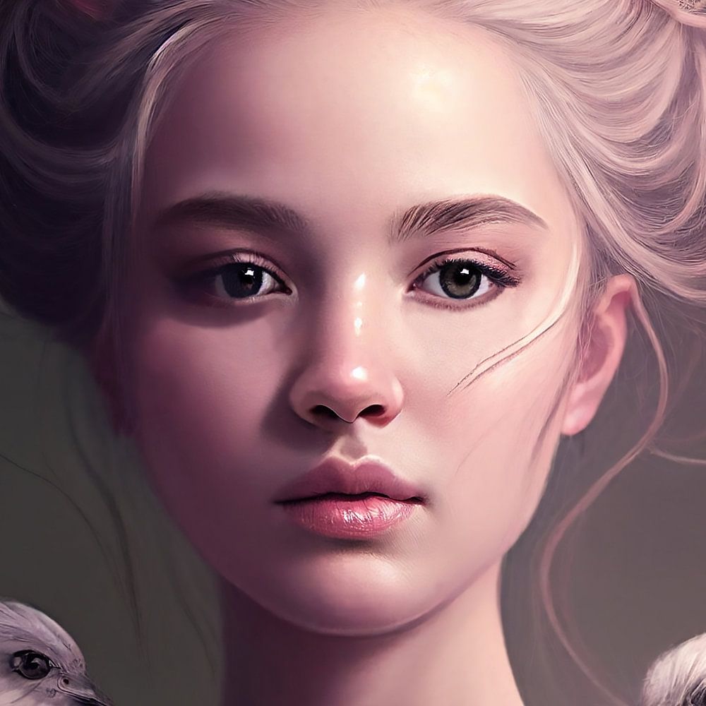 Portrait of a beautiful woman surrounded by birds. In the colour scheme of grey, black, white and pink. Refined image that leaves somewhat to the imagination.