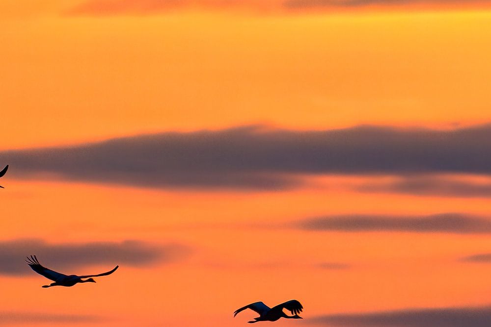 Crane birds flying in a sunset during autumn migration  by Sjoerd van der Wal Photography