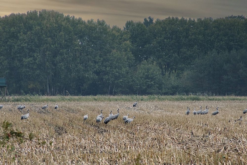 Buy this landscape artwork Cranes on a harvested field by Martin Köbsch on canvas, ArtFrame, poster and wallpaper, printed on demand in high quality.