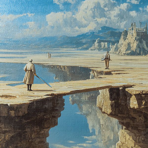 A hauntingly surreal depiction of a pyramid connected by an enigmatic bridge over a foggy abyss. Rendered in vintage art oil painting style, with creepy, unbelievable surrealism and intricate details that evoke mystery and wonder.