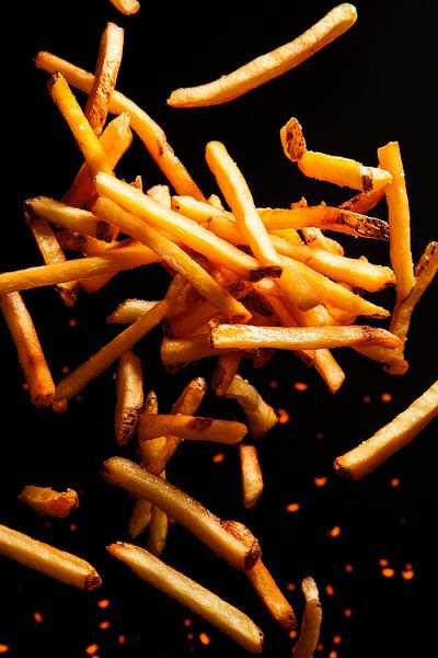 Crispy, golden-brown fries seem to dance weightlessly through the air, their deliciousness promising an indulgent experience. The deep black backdrop lets the vibrant colours shine and awakens appetite and anticipation. This picture is perfect for the kitchen or dining room, where culinary delights take centre stage.