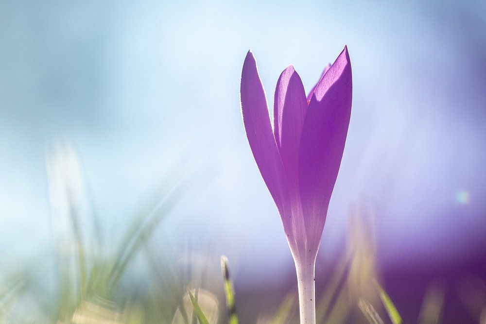 Purple crocus backlit in the Seepark in Freiburg in February. First harbinger of spring in 2023.