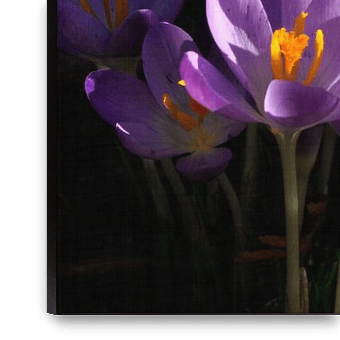 A panoramic photo of crocuses in my garden. The sun only illuminates the front row of crocuses which gives an exciting effect. Colourful winter bloomers with their orange pistils.