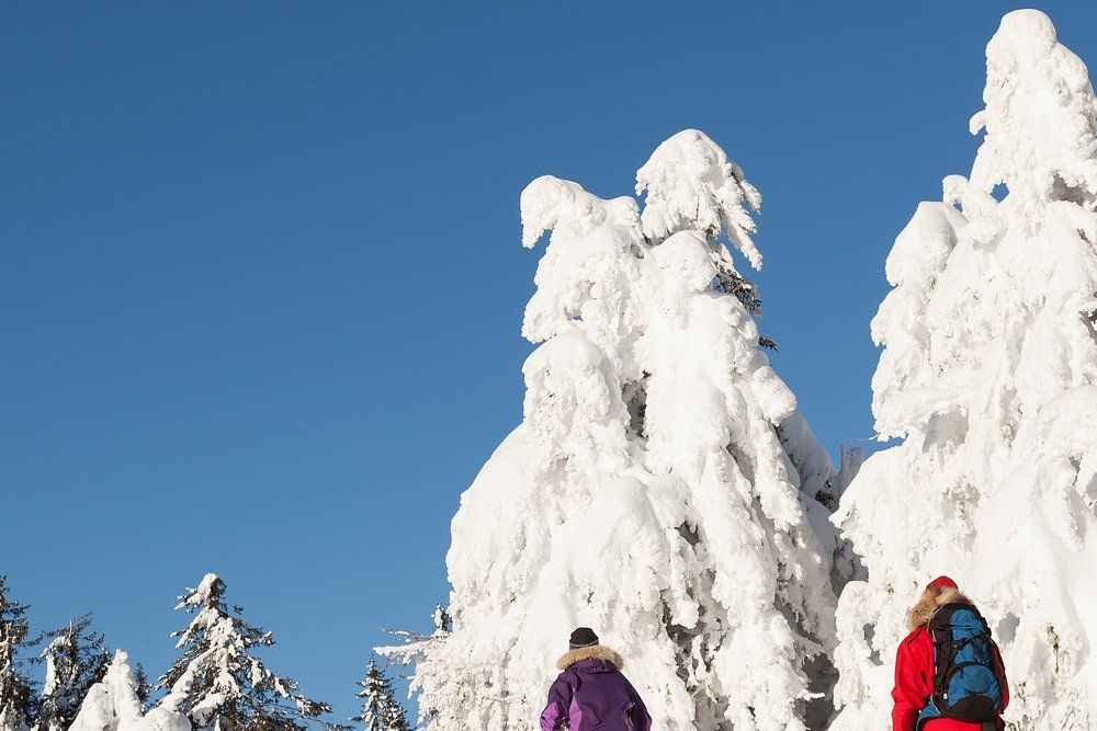 Cross-country skiers on a sunny day after a snowstorm near Sjusjoen lake near Lillehammer Norway