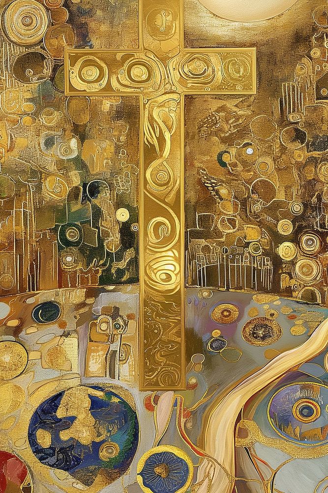 'Cross of Cosmic Order' is a spiritual tableau in which the cross rises like a golden pillar amid a heavenly landscape of solar systems and divine energy. The sun, depicted as a radiant circle of light, symbolises the omnipotence of God, while the earth and other planets depict the connectedness of all creation. The circular patterns and shades of gold reflect the holiness and perfection central to the doctrine of faith. It is an invitation to contemplate the grandeur and orderly harmony of the universe, as reflected in the Christian faith.