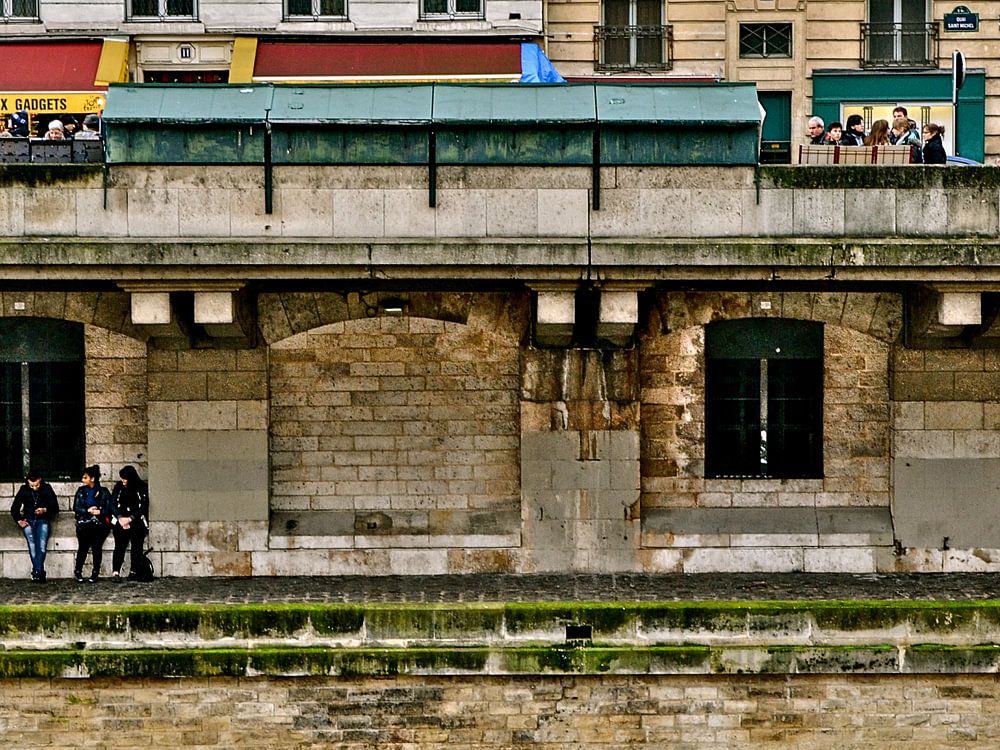 Life along the Seine in Paris, with people recreating, typical stalls and buildings