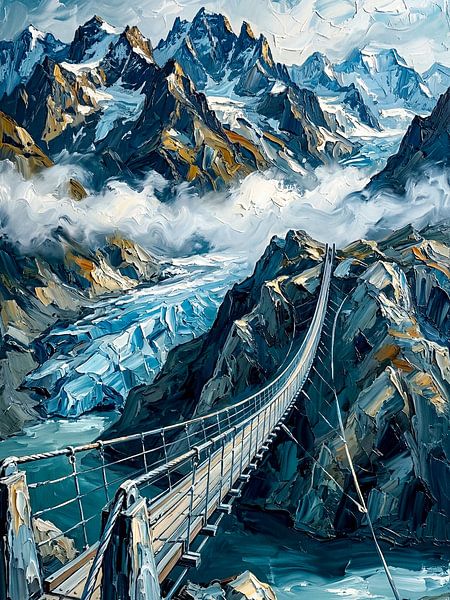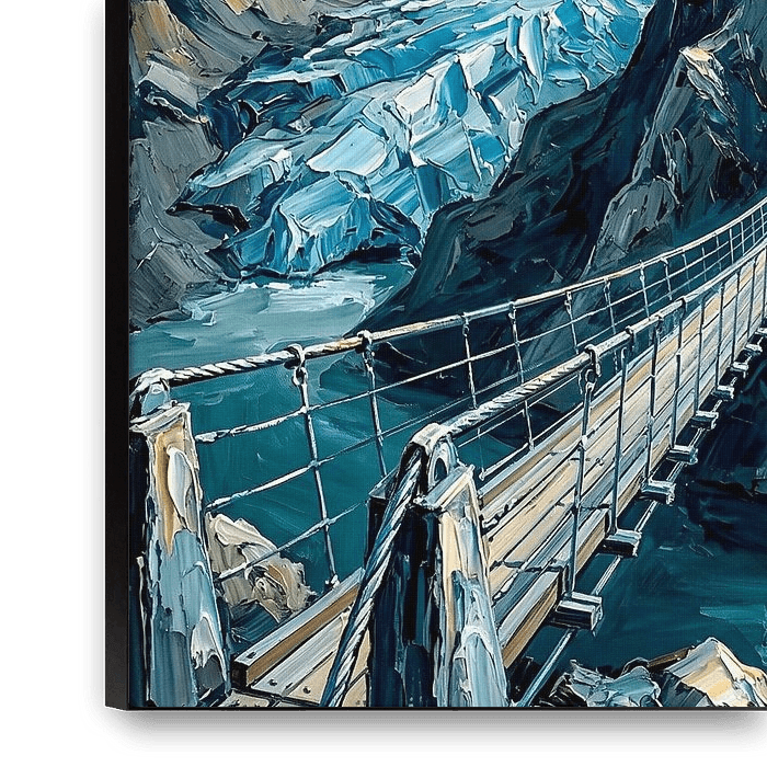 Inspired by the dramatic Trift Bridge, this impasto painting captures a suspended path across vast alpine heights. Bold textures and cinematic contrast evoke tension, scale, and the thrill of quiet exploration.