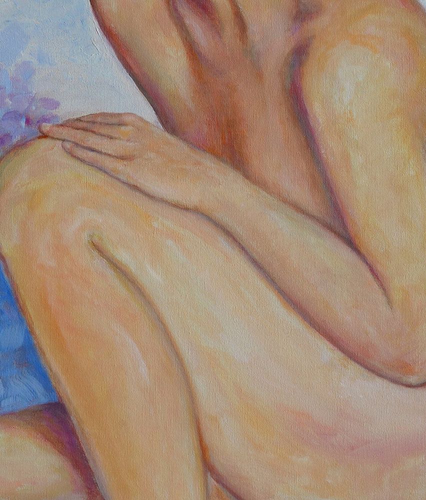 Drawing of a girl, naked in color. The sexy model sits sensually on the ground and as a nude model radiates eroticism with visible shoulders, chest, hips, thighs and legs.