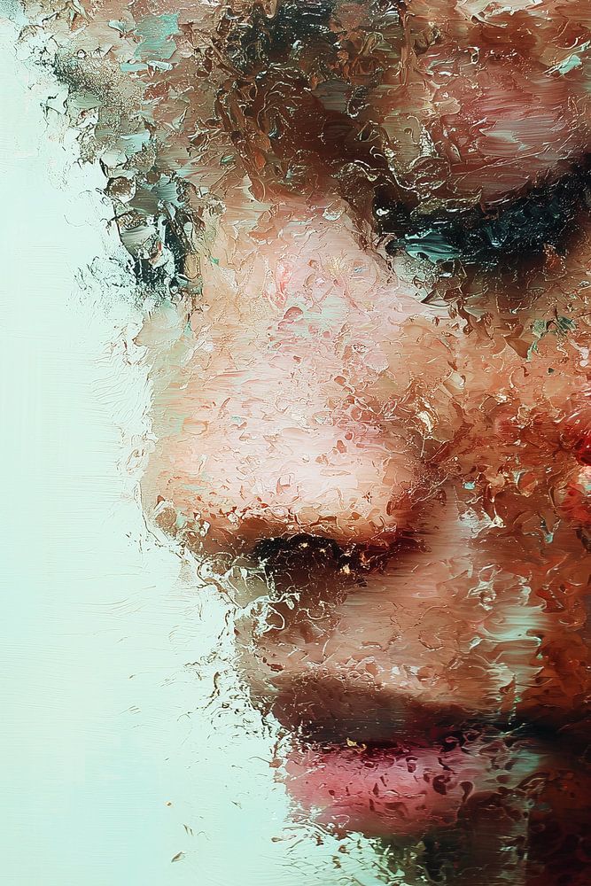 A melancholic face behind a haze of watery paint strokes. As if emotions cannot be captured in words, but only in flowing colours.