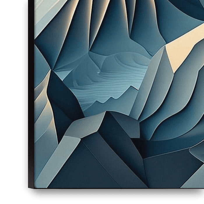 The painting is an artistic representation of the Alps, emphasising their dramatic and jagged peaks in a unique, abstract style. The mountainous terrain is characterised by sharp, angular ridges and valleys, all of which appear to have been sculpted with great care. The use of blue, white and gold tones creates a dynamic visual…