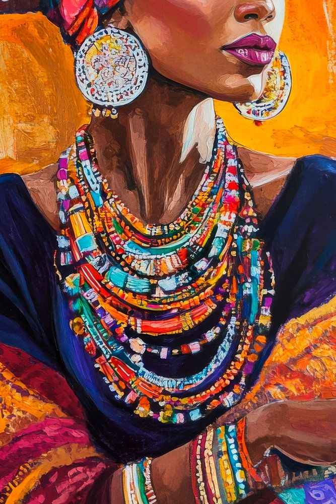 In a fascinating interplay of colours and patterns, an impressive woman shines with a majestic bearing. Her skilfully tied headscarf and the shimmering, varied necklaces lend her an air of elegance and dignity. The vivid, warm tones of the background frame her radiance and invite the viewer to sense her story.