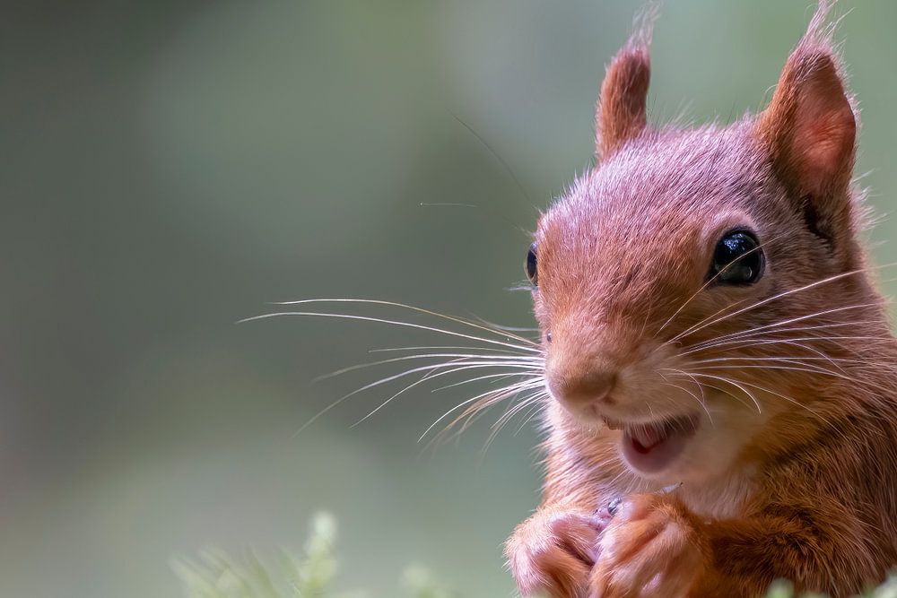 Curious look at the squirrel from behind the grass. Green bokeh background. Forest as background. Sciurus vulgaris