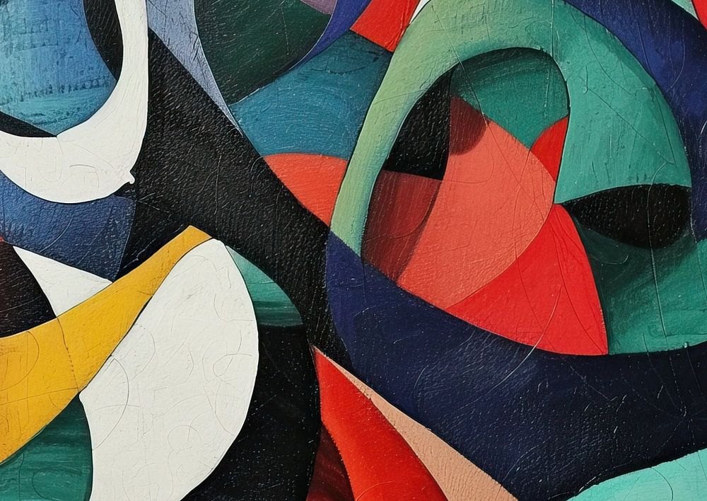 Curve Festival - This abstract painting is a fascinating explosion of colour and form, where colours and abstract shapes merge into a visually intriguing whole. The artwork consists of overlapping and interwoven shapes that feel almost sculptural. The composition shows a series of curved and angular shapes that create both harmony and contrast with each other. The dominant colours include deep tones of blue, red and green, alongside softer tones such as ivory white and pastel orange. Linear textures are subtly visible behind the vibrant colours, adding an extra layer of depth. This abstract painting is a play of visual elements where shapes and colours seem to be in constant dialogue with each other, inviting endless interpretation from the viewer.