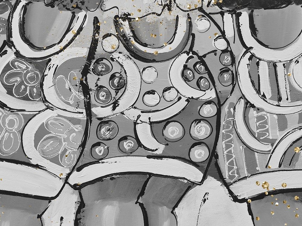 Step into the enchanting world of the well-known plump ladies, now adorned in a contemporary and stylish palette of black and white, enriched with subtle golden accents. This masterpiece captures joyful moments of conviviality, where the full figures of the ladies shine amidst their festive gathering.