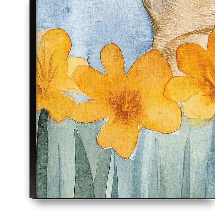 This charming artwork shows an adorable ginger cat with wide, curious green eyes peeking over a field of vibrant orange blossoms.