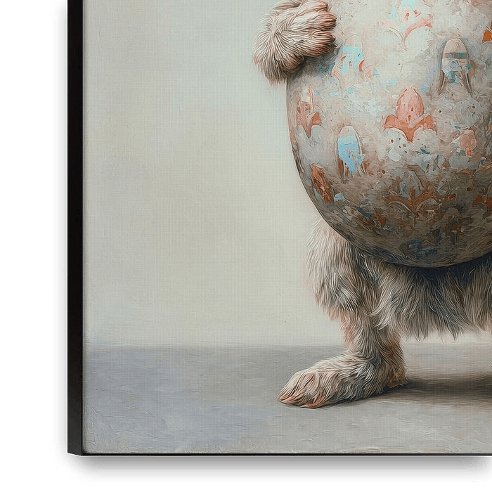 A sweet, gentle hare stands upright, holding a large, painted egg close to its chest. Its gaze is calm and curious, as if inviting you to pause for a moment and savour the moment. The egg is richly decorated with subtle patterns and soft colours such as pastel blue, warm pink and light earth tones, giving the whole piece a dreamy and…