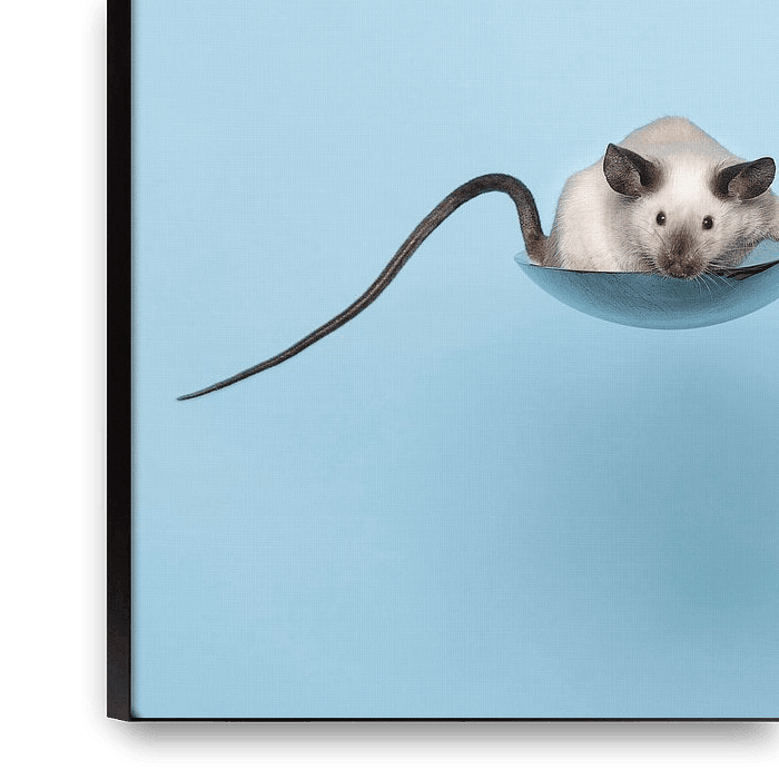 About ‘Cute siamese mouse balances on a soup ladle against a soft blue background’ by Leoniek van der Vliet