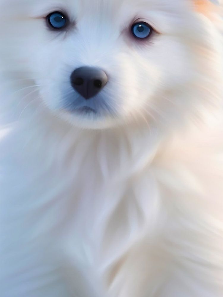 Discover the softness and love of "Cute Snow Dog", a handmade Procreate drawing of a fluffy white dog with sweet blue eyes. Sitting in the snow against a soft blue bokeh background, this little dog radiates love, loyalty and peace.