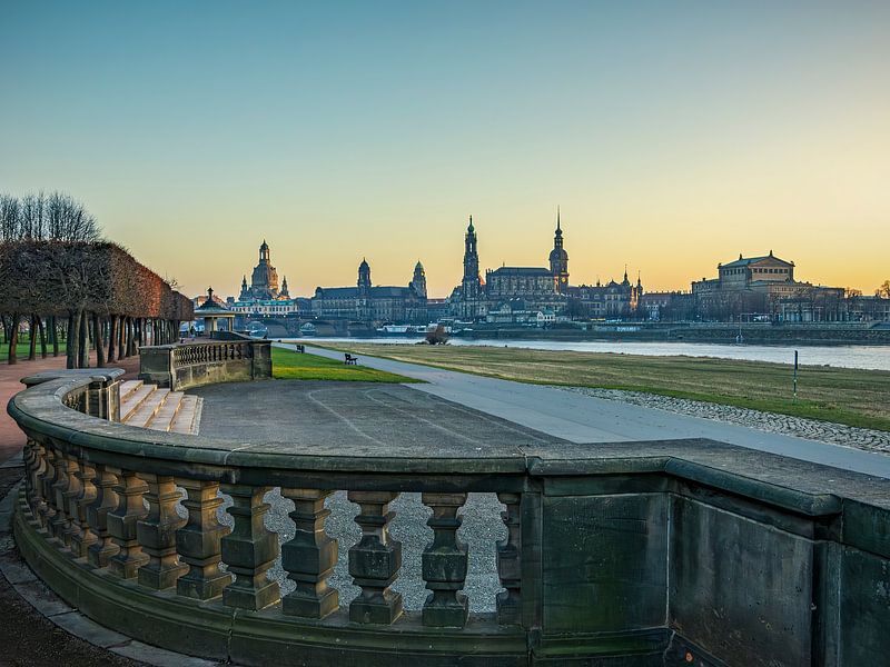 DRESDEN OLD TOWN VIEW: View from the Königsufer (King's Bank) towards the backdrop of the historic old town of Dresden, Saxony, Germany.