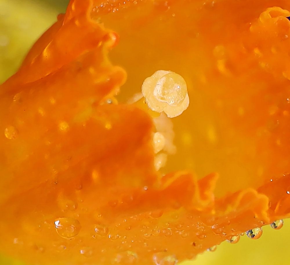 A yellow daffodil with an orange calyx captured in detail with water droplets on the yellow leaves and orange calyx