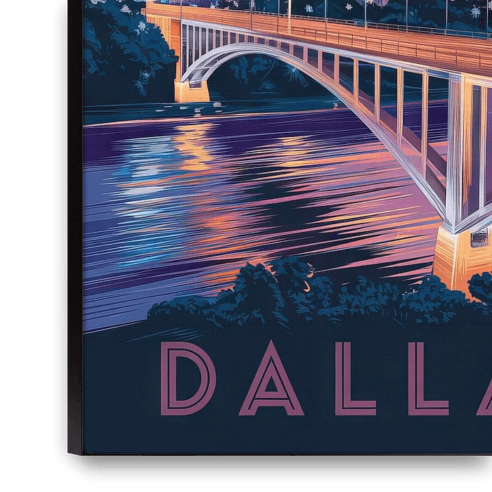 A gorgeous sunset bathes the Dallas skyline in vibrant colours, while the majestic bridge is elegantly stretched across the glistening water. The dynamic clouds and soft light create an inviting atmosphere perfect for a living room. This artwork brings urban charm and joie de vivre to any room.