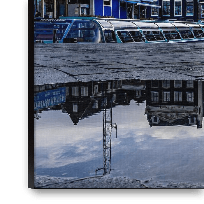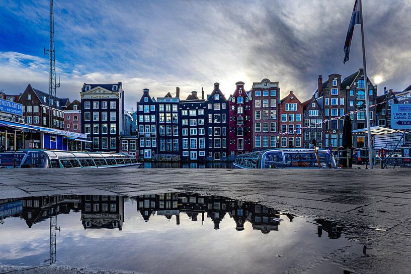 For me, the reflection of the canal houses in the rain puddle and the dramatic image of the opened sky in shades of blue and gold add an extra touch to this picture.