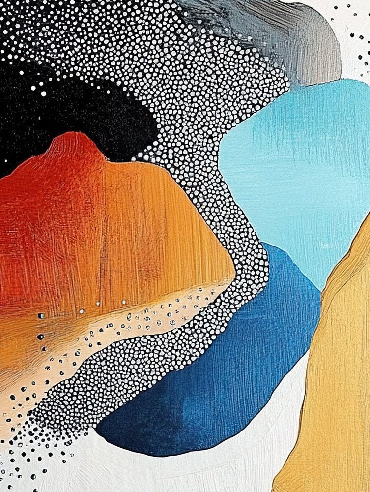 Dance of Coloured Echoes - This abstract painting shows an interplay of spherical patterns and flowing, vibrant colours such as blue, red and yellow, mixed together to form a visually dynamic composition.