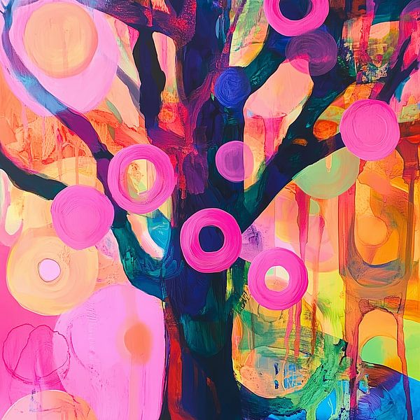 Dans van de Jaarringen is een levendig en intrigerend kunstwerk waarin natuur, tijd en kleur samenkomen in een expressieve compositie. Centraal in het werk staat een krachtige boom, opgebouwd uit diepe donkerblauwe tinten. De boom vormt een rustig, bijna mysterieus ankerpunt in het schilderij. In zijn stam en takken verschijnen hier en…