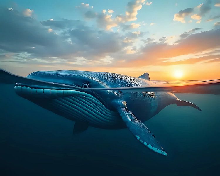 An impressive whale swims majestically through the deep blue waters of the ocean as the sun slowly sets on the horizon. The sky is filled with a breathtaking play of colours in warm shades of orange, pink and purple, creatively reflected in the water. The gentle waves sway harmoniously as the whale, in its full splendour, breaks the…