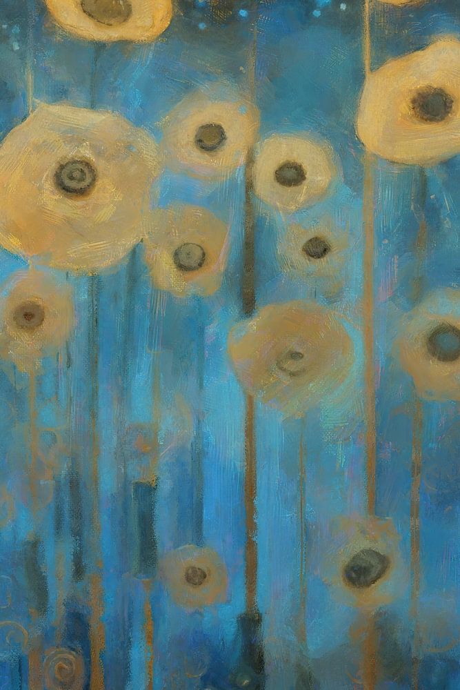 This work depicts an enchanting scene of yellow flowers that seem to dance against a rich, blue background. The flowers stand tall on their stems, like elegant dancers in a vast field. The blue background varies from deep to light, creating a sense of depth and space. The contrast between the warm yellow flowers and the cool blue background gives the piece a vibrant yet serene feel. Perfect for a living room or study, this piece brings a sense of joy and calm to any space.