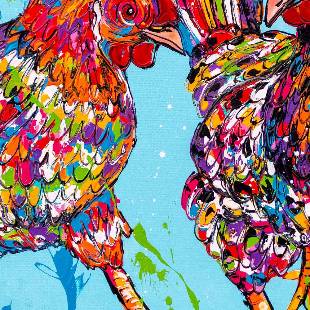 Cheerful colourful chickens in blue by artist Renate Rolefes