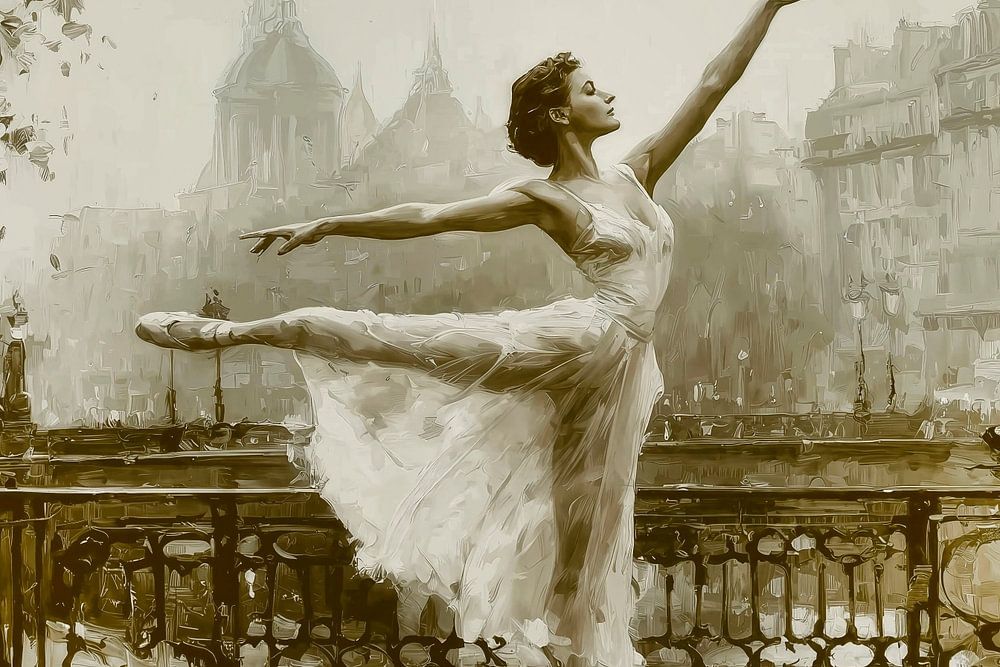 A work of art depicting a graceful ballerina dancing on a bridge over the Seine, with a cityscape of Paris in the background featuring soft, blurred contours of buildings. The overall style is reminiscent of classical paintings, combining elements of impressionism with a nostalgic, dreamlike quality. The colour palette consists of warm…