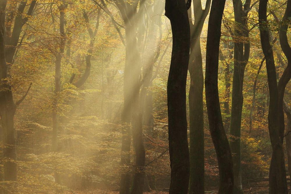 Sunlight shines through the dancing trees in the speulder forest. Sun harps.