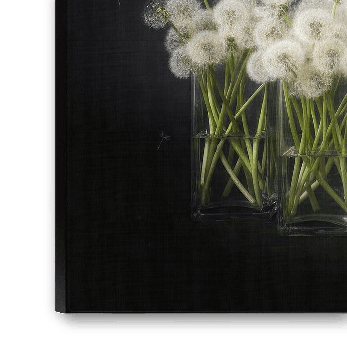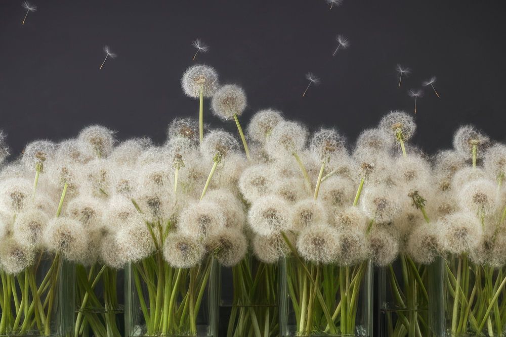 This digital illustration shows a row of glass vases filled with dandelion fluff against a dark background. The image has a calm, clean look.