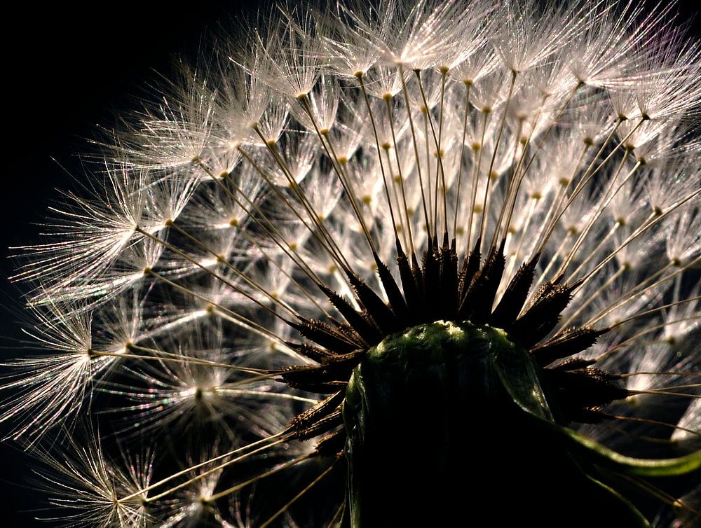 A picture of a dandelion seedball. The silver hairs are clearly visible against the black background. High contrast photo.