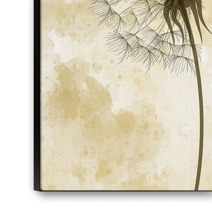 Fluff ball of a Dandelion, the fluff of which is blown by the wind. Composition of a digital line drawing and watercolour techniques. Constructed from soft yellow and subtle earth tones.