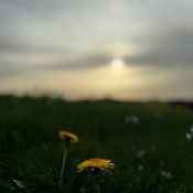 Dandelion in focus: Yellow blossom on a green meadow, against a blurred background with sunset. Atmospheric, natural, macro photography, nature photography.